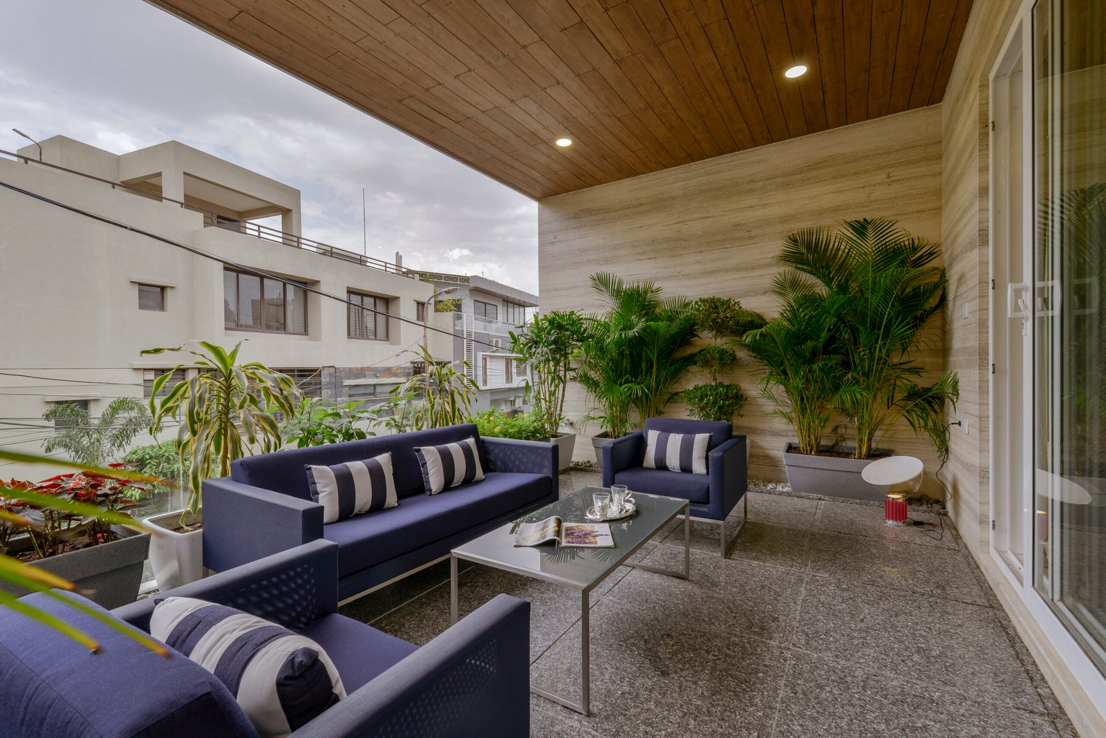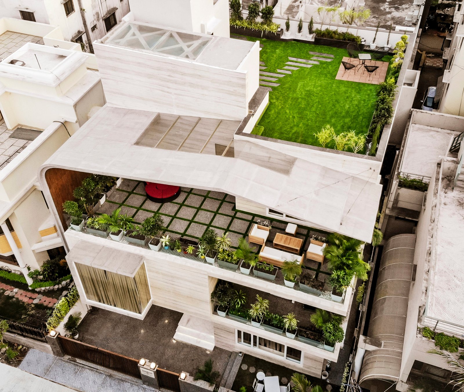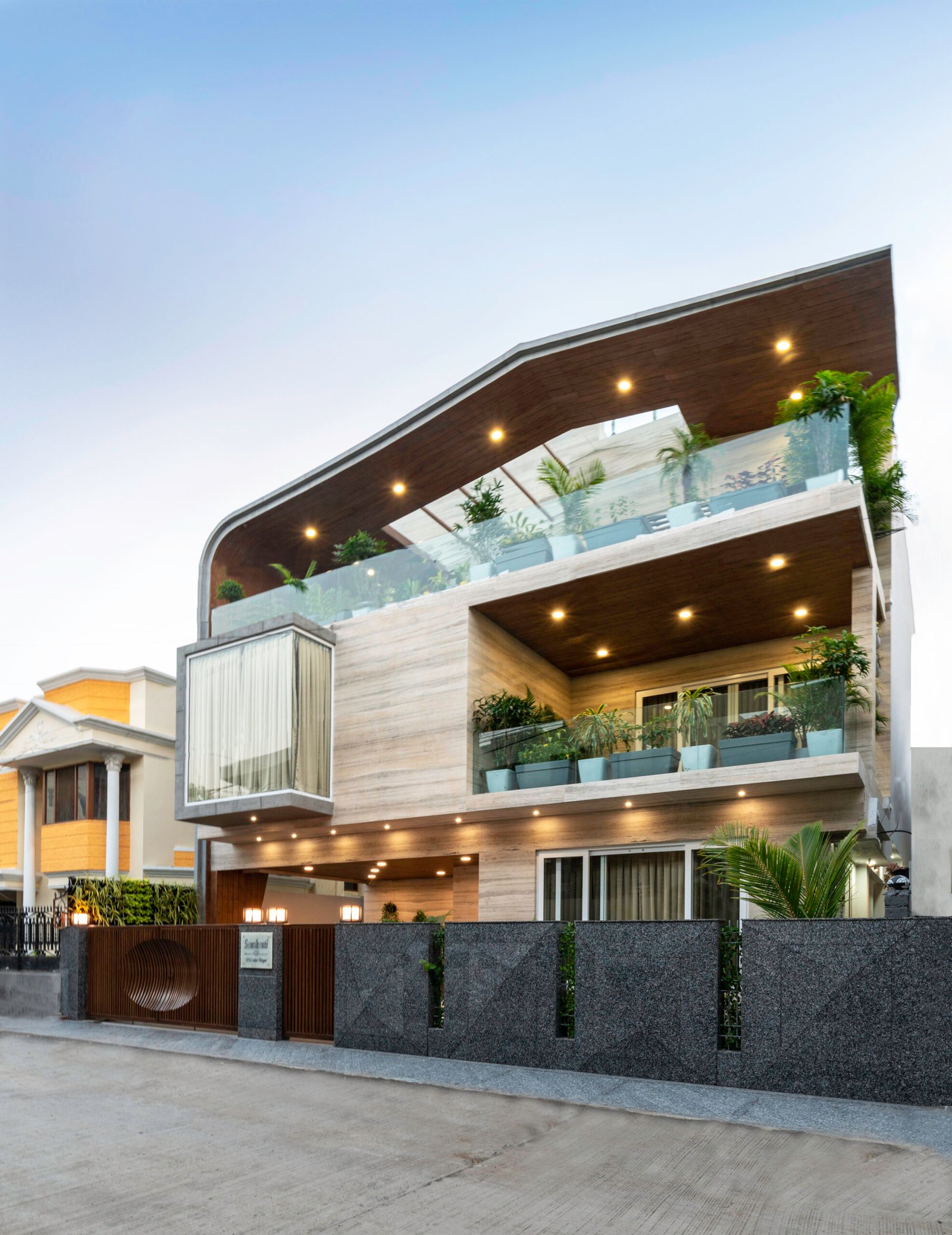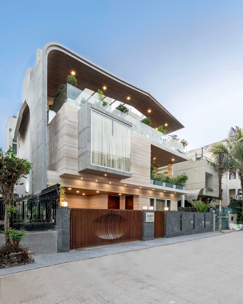 Spanning 7,000 sq ft, Sanskruti stands out with its dramatic fabricated wraparound structure that envelopes the home composed of wooden elements that add warmth and contrast against the expansive travertine stone cladding. A skylight crowns the terrace, filling upper floors with natural light, while the projecting glass corner window of the media room adds architectural tension and visual interest. Internally, the home breaks into a colourful narrative — where lively hues and Italian-imported furniture pieces give each space its own identity. Sanskruti is a bold interplay of structure and soul — where contemporary form, creative detailing, and global taste come together in perfect sync.