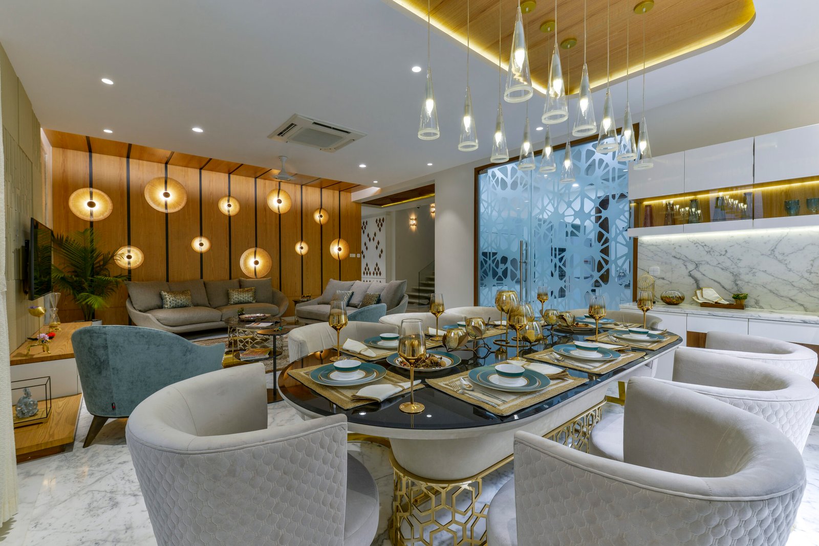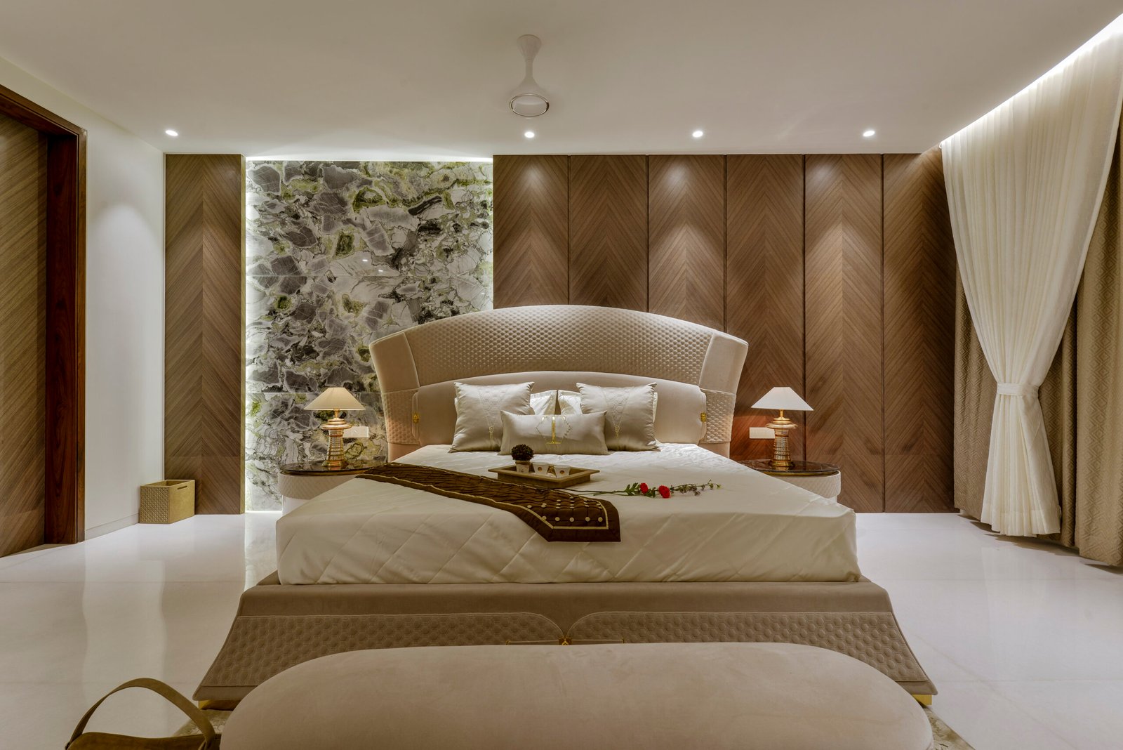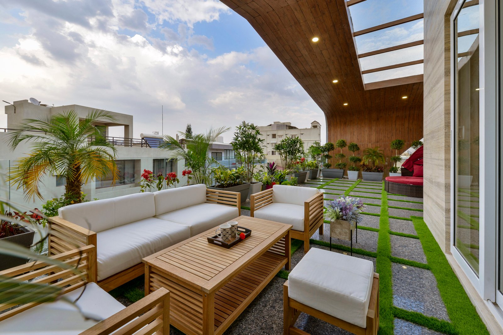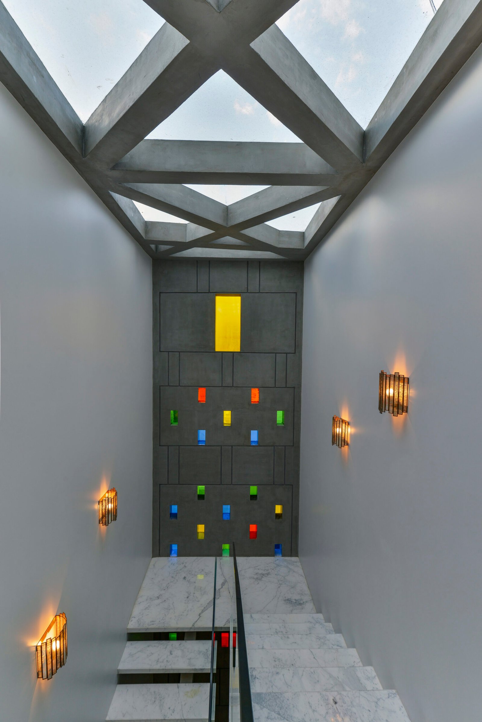 Spanning 7,000 sq ft, Sanskruti stands out with its dramatic fabricated wraparound structure that envelopes the home composed of wooden elements that add warmth and contrast against the expansive travertine stone cladding. A skylight crowns the terrace, filling upper floors with natural light, while the projecting glass corner window of the media room adds architectural tension and visual interest. Internally, the home breaks into a colourful narrative — where lively hues and Italian-imported furniture pieces give each space its own identity. Sanskruti is a bold interplay of structure and soul — where contemporary form, creative detailing, and global taste come together in perfect sync.